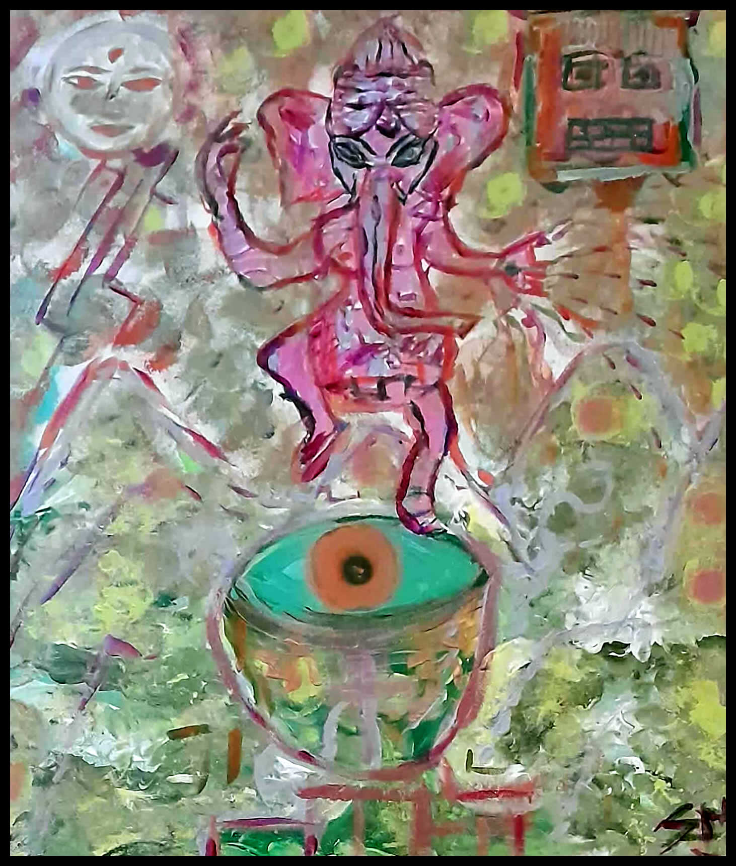 The central figure of Ganesha sits above an artistic symbolic “eye,” representing awareness and protection, while the background carries playful textures and mystical details. This makes the painting not only spiritual but also thought-provoking.